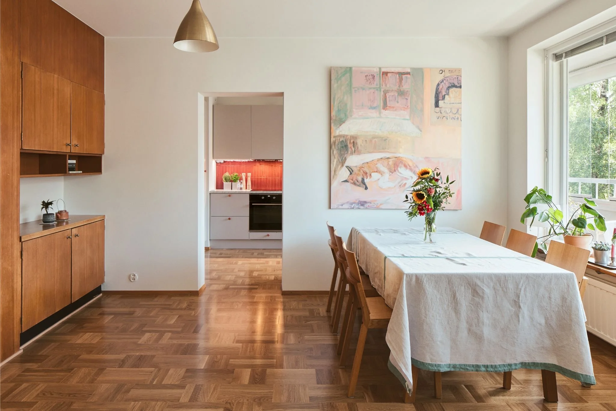 Lopputulos on 60-luvun henkeä kunnioittava, kotoisa ja kutsuva. Asiakkaan omat irtokalusteet, upeat taideteokset sekä monet viherkasvit täydentävät kokonaisuutta kauniisti tuoden kerroksellisuutta ja perheen historian ja tarinan näkyville tiloissa.